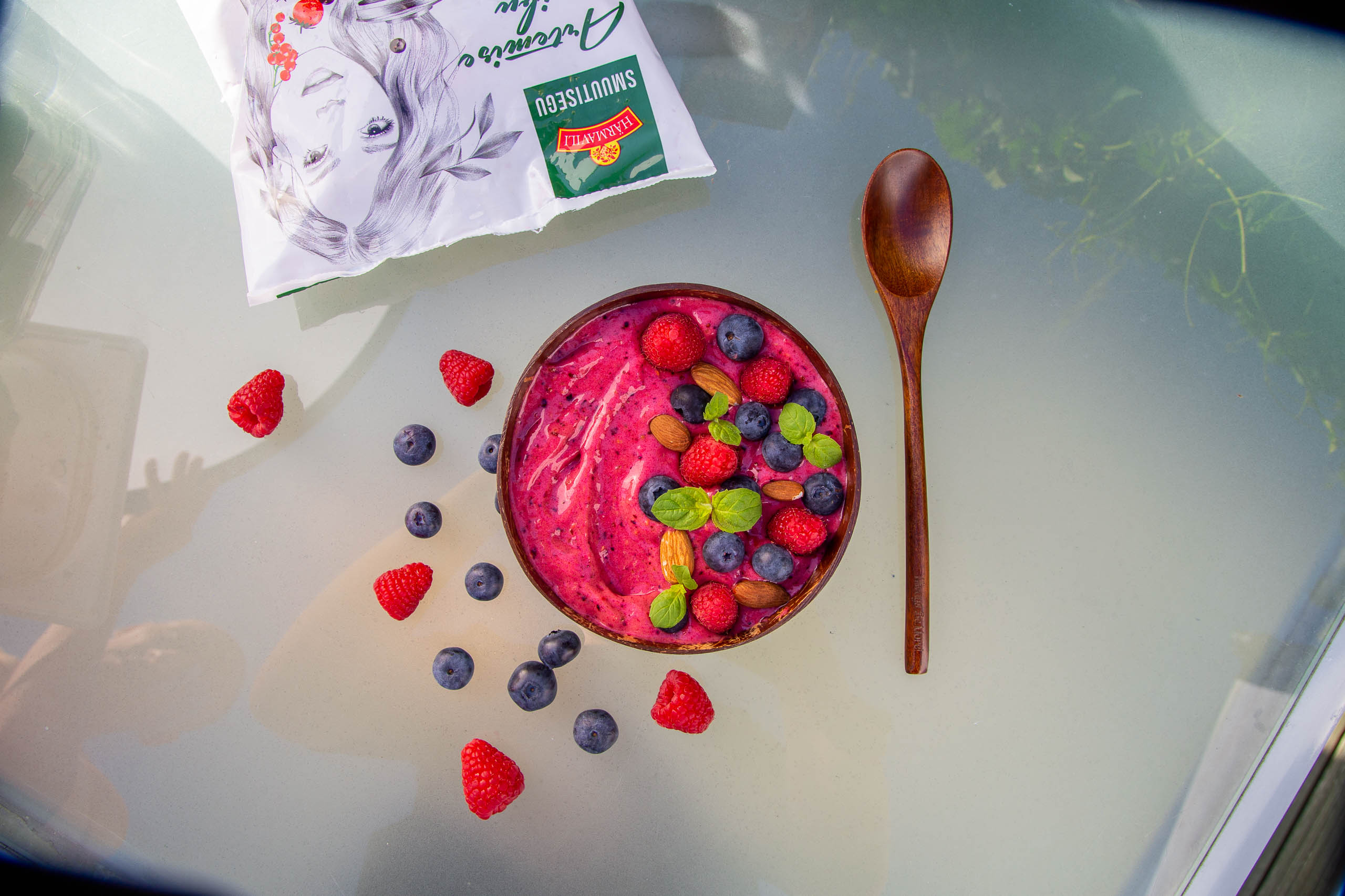 1. Lisa kõik koostisosad Twisterkannu/köögikombaini. Kui Sa teed seda tavalise blenderiga võib Sul olla vajadus lisada juurde ka rohkem vedeliku. (kui sul ei ole banaan külmutatud, siis viiluta banaan umbes 1cm viiludeks ning külmuta vähemalt 6h).
